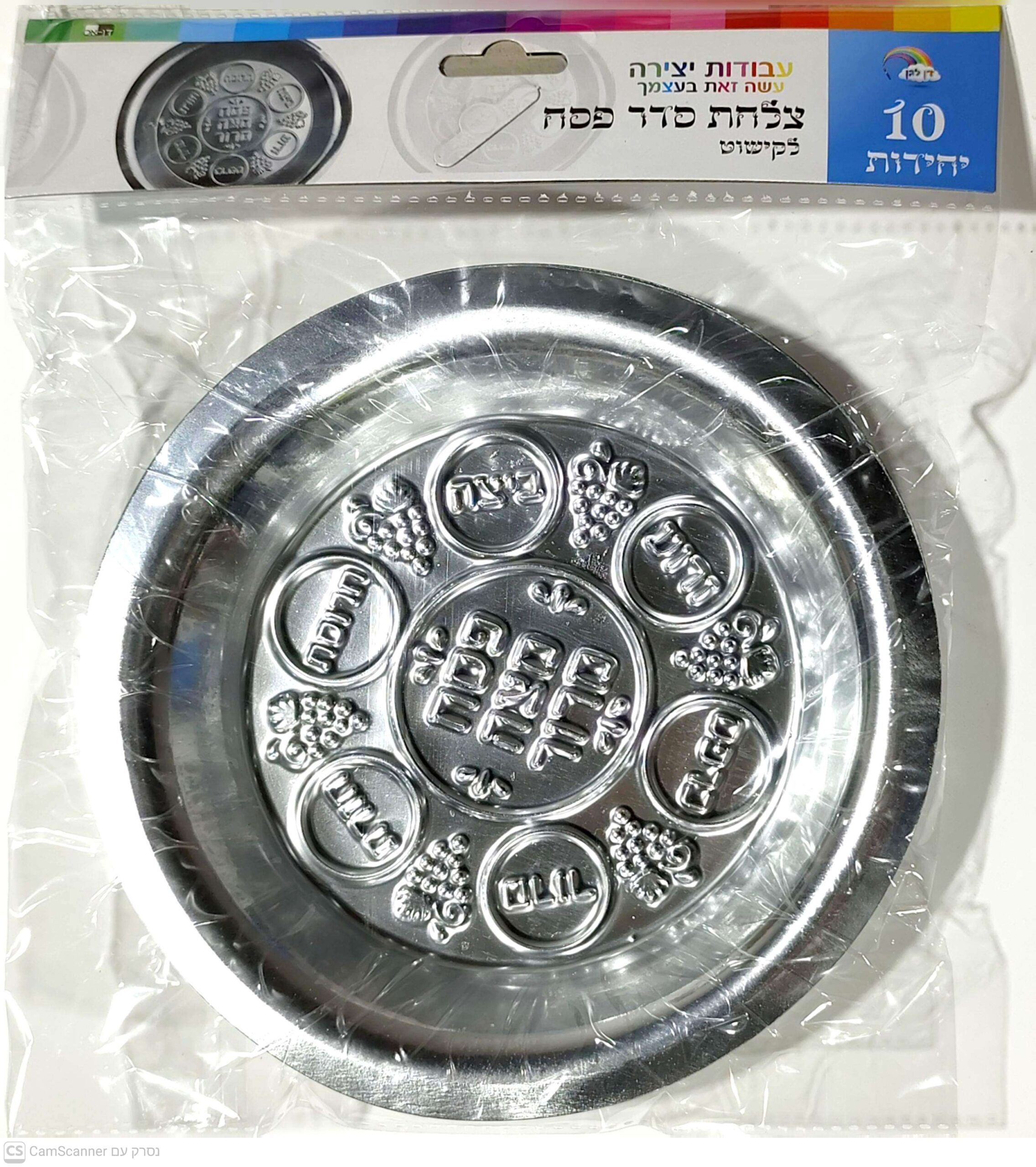 צלחות פלסטיק בגימור כסף, מתאימות לשולחן סדר חגיגי.