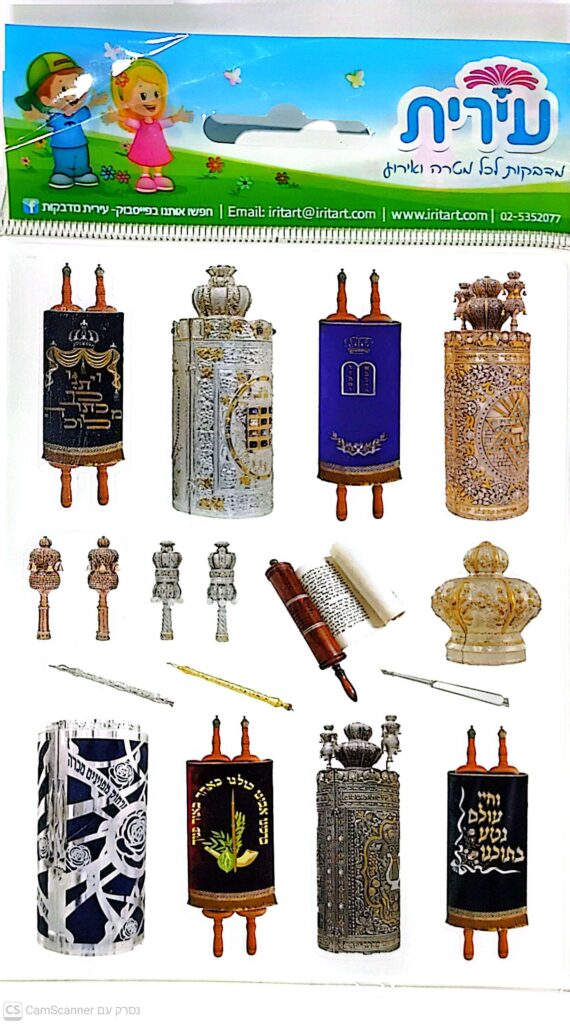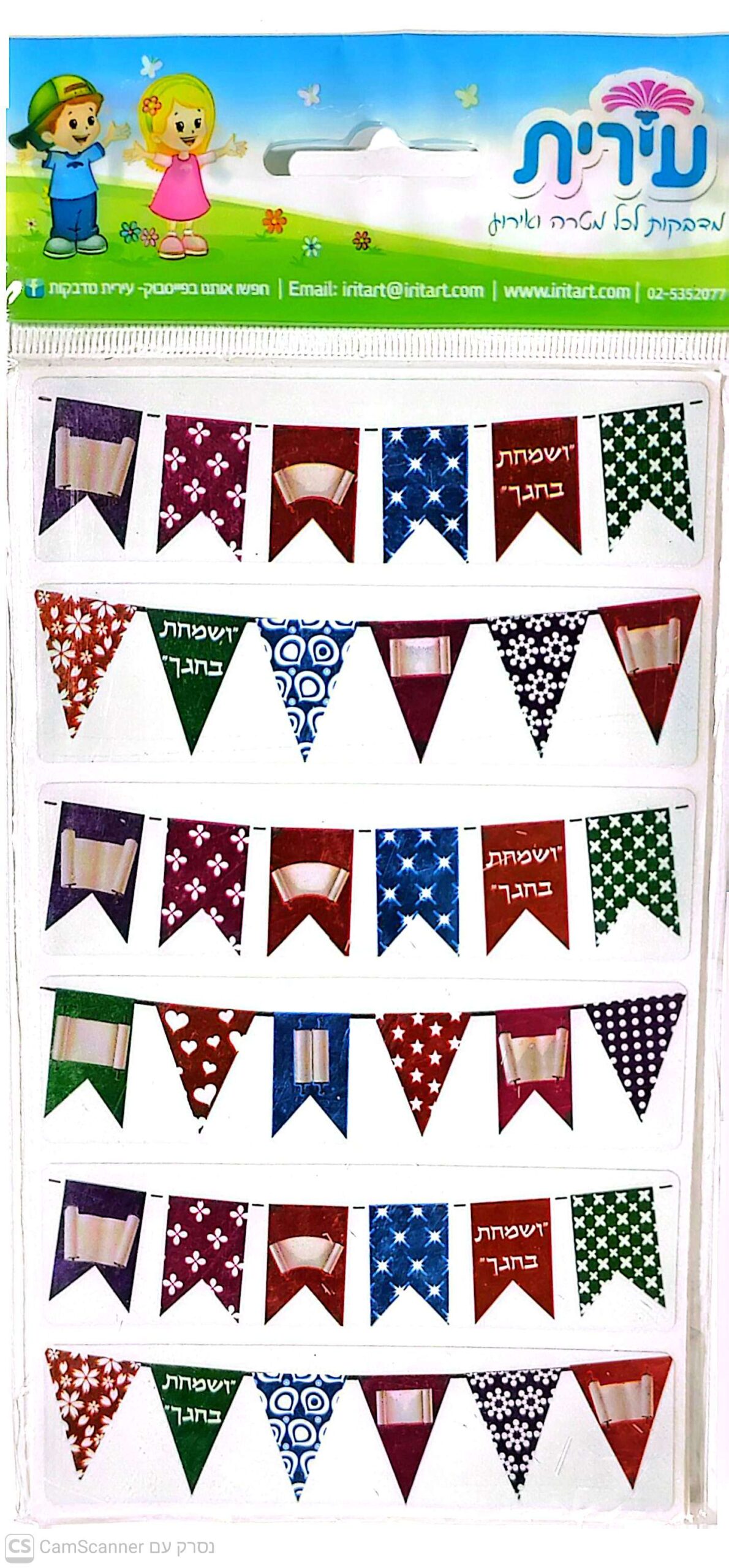 מדבקות צבעוניות לעיטור דגלי שמחת תורה, מוסיפות ברק ושמחה לריקודים ולחגיגות סביב ספרי התורה.